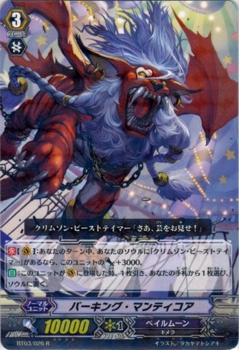 【永】【(V)】:あなたのターン中、あなたのソウルに「クリムゾン・ビーストテイマー」があるなら、このユニットのパワー+3000。【自】:このユニットが(V)に登場した時、1枚引き、あなたの手札から1枚選び、ソウルに置く。