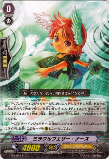 【自】:「ヘブンリー・インジェクター」がこのユニットにライドした時、あなたの山札の上から7枚まで見て、「星辰の癒し手 エルゴディエル」か「運命の癒し手 エルゴディエル」を1枚まで探し、相手に見せ、手札に加え、その山札をシャッフルする。【自】:「ヘブンリー・インジェクター」以外の《エンジェルフェザー》がこのユニットにライドした時、このカードを(R)にコールしてよい。