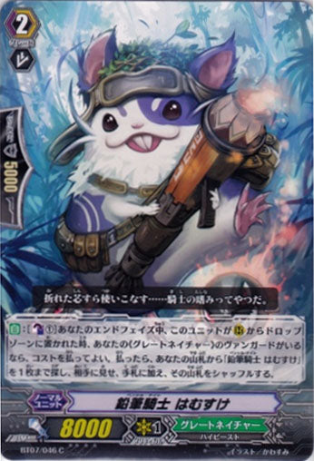 【自】:[【カウンターブラスト】(1)]あなたのエンドフェイズ中、このユニットが(R)からドロップゾーンに置かれた時、あなたの《グレートネイチャー》のヴァンガードがいるなら、コストを払ってよい。払ったら、あなたの山札から「鉛筆騎士 はむすけ」を1枚まで探し、相手に見せ、手札に加え、その山札をシャッフルする。