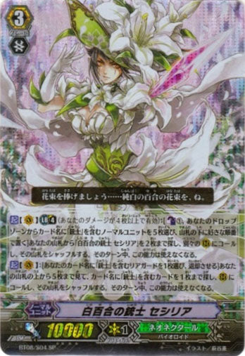 【起】【(V)】【リミットブレイク】(4)(あなたのダメージが4枚以上で有効):[【カウンターブラスト】(1),あなたのドロップゾーンからカード名に「銃士」を含むノーマルユニットを5枚選び、山札の下に好きな順番で置く]あなたの山札から「白百合の銃士 セシリア」を2枚まで探し、別々の(R)にコールし、その山札をシャッフルする。そのターン中、この能力は使えなくなる。【起】【(V)】:[あなたのカード名に「銃士」を含むリアガードを1枚選び、退却させる]あなたの山札の上から5枚まで見て、カード名に「銃士」を含むカードを1枚まで探し、(R)にコールし、その山札をシャッフルする。そのターン中、この能力は使えなくなる。