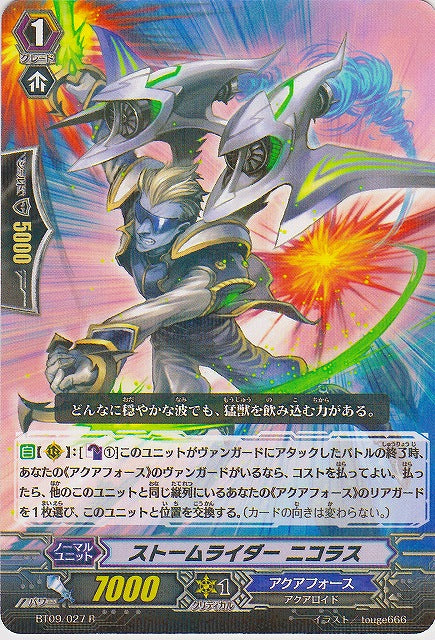 【自】【(R)】:[【カウンターブラスト】(1)]このユニットがヴァンガードにアタックしたバトルの終了時、あなたの《アクアフォース》のヴァンガードがいるなら、コストを払ってよい。払ったら、他のこのユニットと同じ縦列にいるあなたの《アクアフォース》のリアガードを1枚選び、このユニットと位置を交換する。(カードの向きは変わらない。)