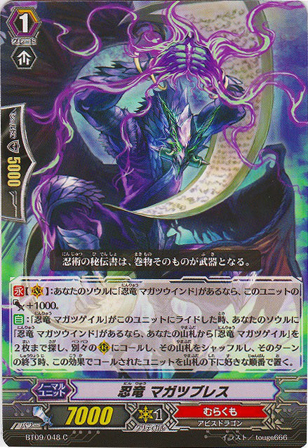 【永】【(V)】:あなたのソウルに「忍竜 マガツウインド」があるなら、このユニットのパワー+1000。【自】:「忍竜 マガツゲイル」がこのユニットにライドした時、あなたのソウルに「忍竜 マガツウインド」があるなら、あなたの山札から「忍竜 マガツゲイル」を2枚まで探し、別々の(R)にコールし、その山札をシャッフルし、そのターンの終了時、この効果でコールされたユニットを山札の下に好きな順番で置く。