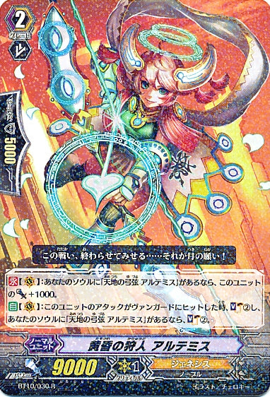 【永】【(V)】:あなたのソウルに「天地の弓弦 アルテミス」があるなら、このユニットのパワー+1000。【自】【(V)】:このユニットのアタックがヴァンガードにヒットした時、【ソウルチャージ】(2)し、あなたのソウルに「天地の弓弦 アルテミス」があるなら、【ソウルチャージ】(2)。