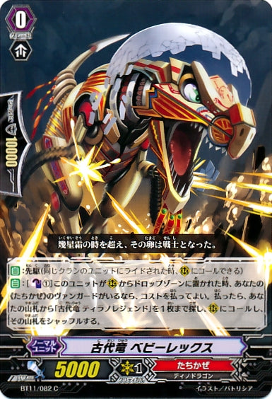 【自】:先駆(同じクランのユニットにライドされた時、(R)にコールできる)【自】:[【カウンターブラスト】(1)]このユニットが(R)からドロップゾーンに置かれた時、あなたの《たちかぜ》のヴァンガードがいるなら、コストを払ってよい。払ったら、あなたの山札から「古代竜 ティラノレジェンド」を1枚まで探し、(R)にコールし、その山札をシャッフルする。