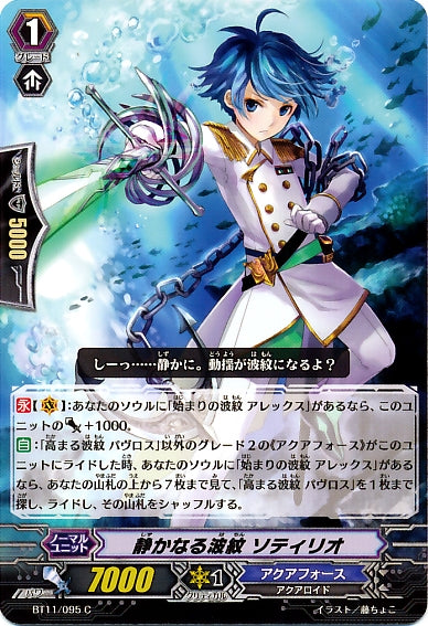 【永】【(V)】:あなたのソウルに「始まりの波紋 アレックス」があるなら、このユニットのパワー+1000。【自】:「高まる波紋 パヴロス」以外のグレード2の《アクアフォース》がこのユニットにライドした時、あなたのソウルに「始まりの波紋 アレックス」があるなら、あなたの山札の上から7枚まで見て、「高まる波紋 パヴロス」を1枚まで探し、ライドし、その山札をシャッフルする。