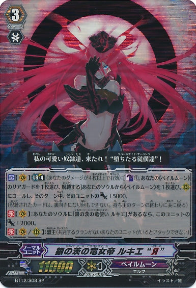 【起】【(V)】【リミットブレイク】(4)(あなたのダメージが4枚以上で有効):[【カウンターブラスト】(1),あなたの《ペイルムーン》のリアガードを1枚選び、呪縛する]あなたのソウルから《ペイルムーン》を1枚選び、(R)にコールし、そのターン中、そのユニットのパワー+5000。(呪縛されたカードは、裏向きになり何もできない。持ち主のターンの終わりに表に戻る)【永】【(V)】:あなたのソウルに「銀の茨の竜使い ルキエ」があるなら、このユニットのパワー+2000。【永】【(V)/(R)】:盟主(共通するクランがないあなたのユニットがいるとアタックできない)