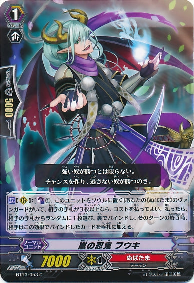 【起】【(R)】:[【カウンターブラスト】(1),このユニットをソウルに置く]あなたの《ぬばたま》のヴァンガードがいて、相手の手札が3枚以上なら、コストを払ってよい。払ったら、相手の手札からランダムに1枚選び、裏でバインドし、そのターンの終了時、相手はこの効果でバインドしたカードを手札に加える。