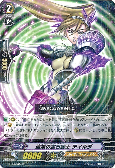 【自】【(R)】:[【カウンターブラスト】(1)]あなたのカード名に「宝石騎士」を含むグレード3のユニットが(V)に登場した時、コストを払ってよい。払ったら、あなたの山札からグレード1以下の《ロイヤルパラディン》を1枚まで探し、(R)にコールし、その山札をシャッフルする。