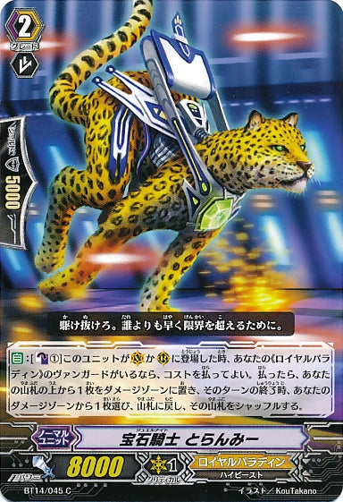 【自】:[【カウンターブラスト】(1)]このユニットが(V)か(R)に登場した時、あなたの《ロイヤルパラディン》のヴァンガードがいるなら、コストを払ってよい。払ったら、あなたの山札の上から1枚をダメージゾーンに置き、そのターンの終了時、あなたのダメージゾーンから1枚選び、山札に戻し、その山札をシャッフルする。