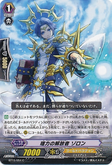 【自】:[このユニットをソウルに置く]このユニットが山札から(R)に登場した時、あなたの《ゴールドパラディン》のヴァンガードがいるなら、コストを払ってよい。払ったら、あなたの山札の上から3枚見て、カード名に「解放者」を含むカードを1枚まで探し、(R)にコールし、残りのカードを山札の下に好きな順番で置く。