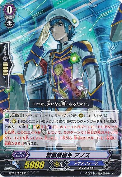 【自】:先駆(同じクランのユニットにライドされた時、(R)にコールできる)【起】【(R)】:[このユニットをソウルに置く]あなたのヴァンガードを1枚選び、そのターン中、『【自】【(V)】:[【カウンターブラスト】(1)]このユニットがヴァンガードにアタックした時、このユニットが【双闘】していて、そのターンで4回目以降のバトル中なら、コストを払ってよい。払ったら、1枚引き、相手のリアガードを1枚選び、退却させる。』を与える。