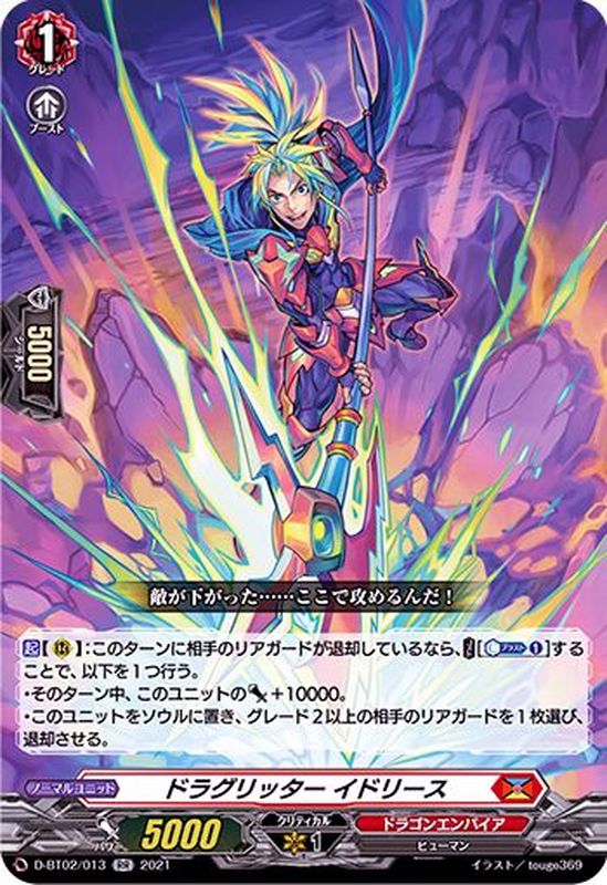 【起】【(R)】:このターンに相手のリアガードが退却しているなら、【コスト】[【カウンターブラスト】(1)]することで、以下を1つ行う。・そのターン中、このユニットのパワー+10000。・このユニットをソウルに置き、グレード2以上の相手のリアガードを1枚選び、退却させる。