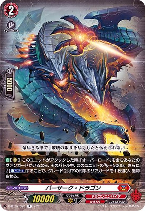 【自】【(R)】:このユニットがアタックした時、「オーバーロード」を含むあなたのヴァンガードがいるなら、そのバトル中、このユニットのパワー+5000。さらに【コスト】[【カウンターブラスト】(1)]することで、グレード2以下の相手のリアガードを1枚選び、退却させる。