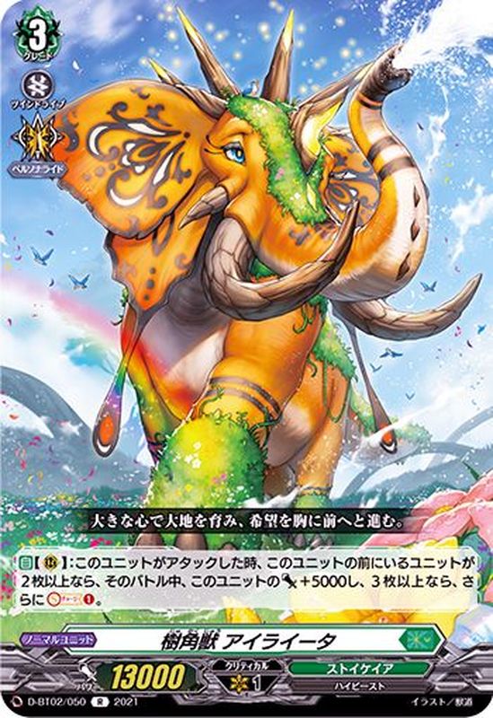 【自】【(R)】:このユニットがアタックした時、このユニットの前にいるユニットが2枚以上なら、そのバトル中、このユニットのパワー+5000し、3枚以上なら、さらに【ソウルチャージ】(1)。