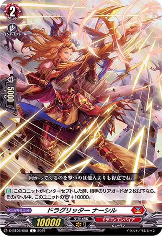 【自】:このユニットがインターセプトした時、相手のリアガードが2枚以下なら、そのバトル中、このユニットのシールド+10000。