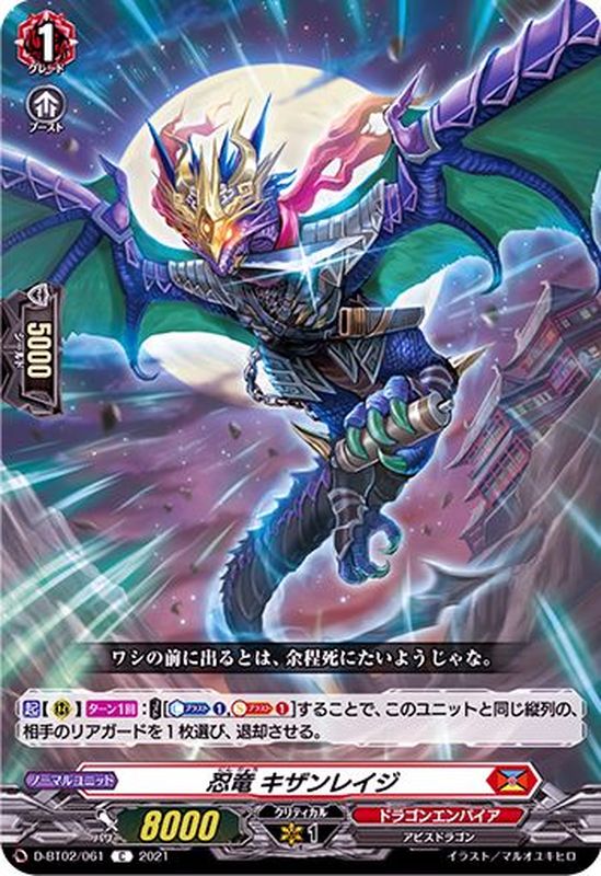 【起】【(R)】【ターン1回】:【コスト】[【カウンターブラスト】(1),【ソウルブラスト】(1)]することで、このユニットと同じ縦列の、相手のリアガードを1枚選び、退却させる。