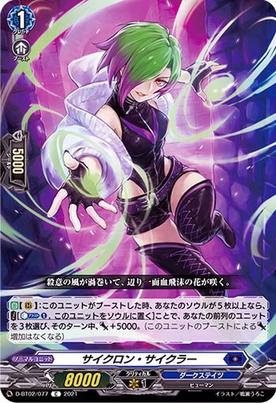 【自】【(R)】:このユニットがブーストした時、あなたのソウルが5枚以上なら、【コスト】[【カウンターブラスト】(1),このユニットをソウルに置く]ことで、あなたの前列のユニットを3枚選び、そのターン中、パワー+5000。(このユニットのブーストによるパワー増加はなくなる)