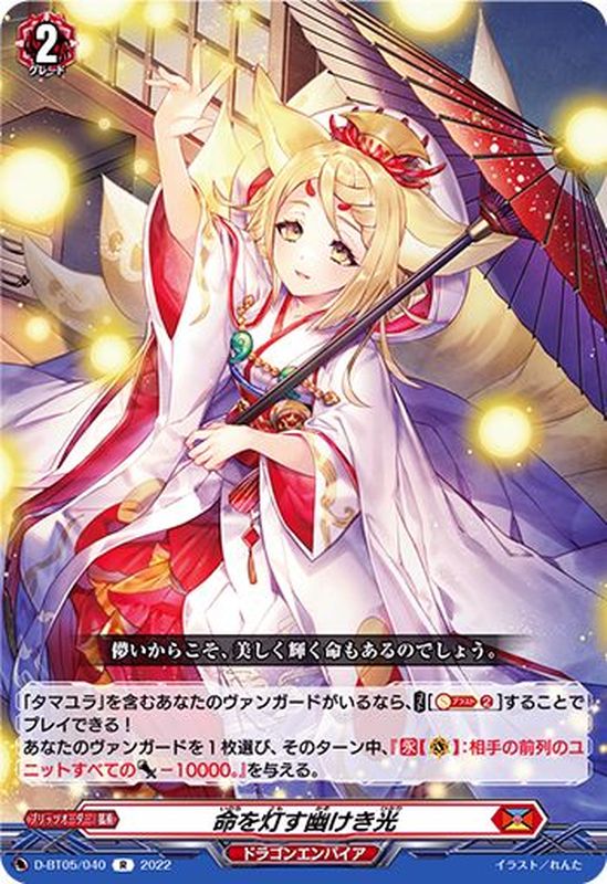 「タマユラ」を含むあなたのヴァンガードがいるなら、【コスト】[【ソウルブラスト】(2)]することでプレイできる!あなたのヴァンガードを1枚選び、そのターン中、『【永】【(V)】:相手の前列のユニットすべてのパワー-10000。』を与える。