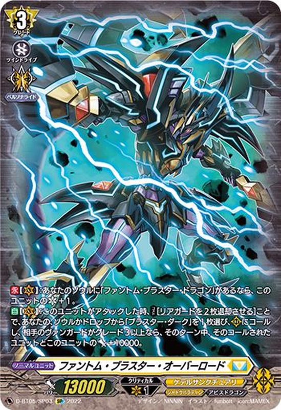 【永】【(V)】:あなたのソウルに「ファントム・ブラスター・ドラゴン」があるなら、このユニットのクリティカル+1。【自】【(V)】:このユニットがアタックした時、【コスト】[リアガードを2枚退却させる]ことで、あなたの、ソウルかドロップから「ブラスター・ダーク」を1枚選び、(R)にコールし、相手のヴァンガードがグレード3以上なら、そのターン中、そのコールされたユニットとこのユニットのパワー+10000。