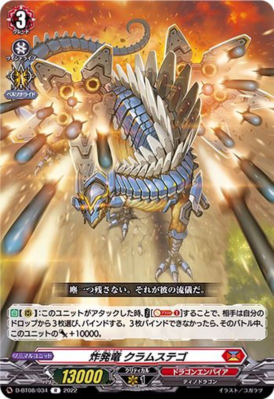 【自】【(R)】:このユニットがアタックした時、【コスト】[【ソウルブラスト】(1)]することで、相手は自分のドロップから3枚選び、バインドする。3枚バインドできなかったら、そのバトル中、このユニットのパワー+10000。