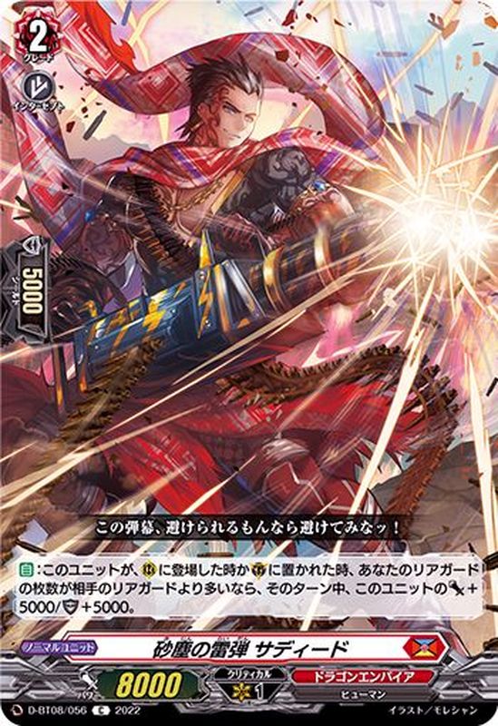 【自】:このユニットが、(R)に登場した時か(G)に置かれた時、あなたのリアガードの枚数が相手のリアガードより多いなら、そのターン中、このユニットのパワー+5000/シールド+5000。