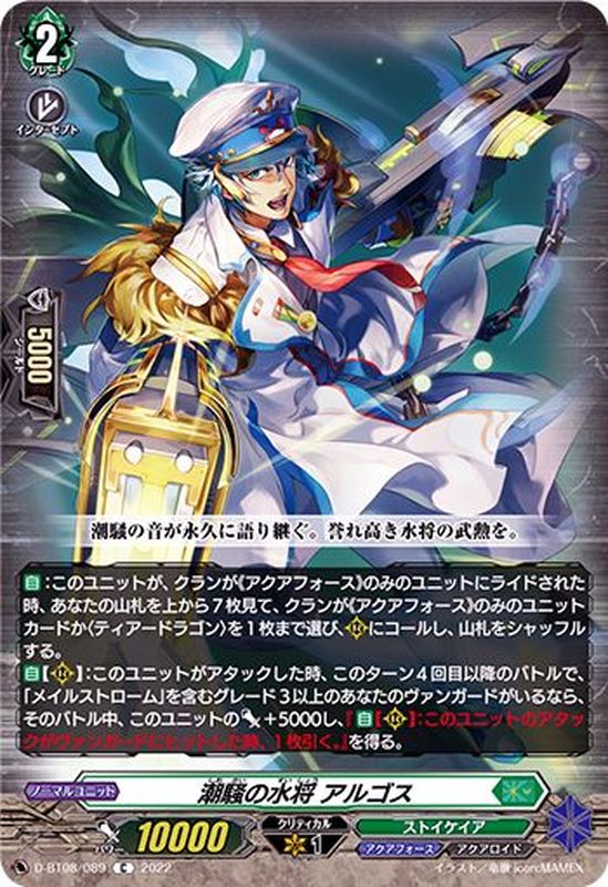 【自】:このユニットが、クランが《アクアフォース》のみのユニットにライドされた時、あなたの山札を上から7枚見て、クランが《アクアフォース》のみのユニットカードか〈ティアードラゴン〉を1枚まで選び、(R)にコールし、山札をシャッフルする。【自】【(R)】:このユニットがアタックした時、このターン4回目以降のバトルで、「メイルストローム」を含むグレード3以上のあなたのヴァンガードがいるなら、そのバトル中、このユニットのパワー+5000し、『【自】【(R)】:このユニットのアタックがヴァンガードにヒットした時、1枚引く。』を得る。
