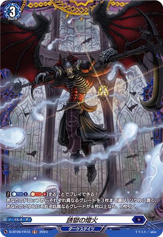 【コスト】[【カウンターブラスト】(1),【ソウルブラスト】(3)]することでプレイできる!あなたのドロップからそれぞれ異なるグレードを3枚まで選び、ソウルに置く。あなたのソウルにそれぞれ異なるグレードが4枚以上なら、1枚引く。