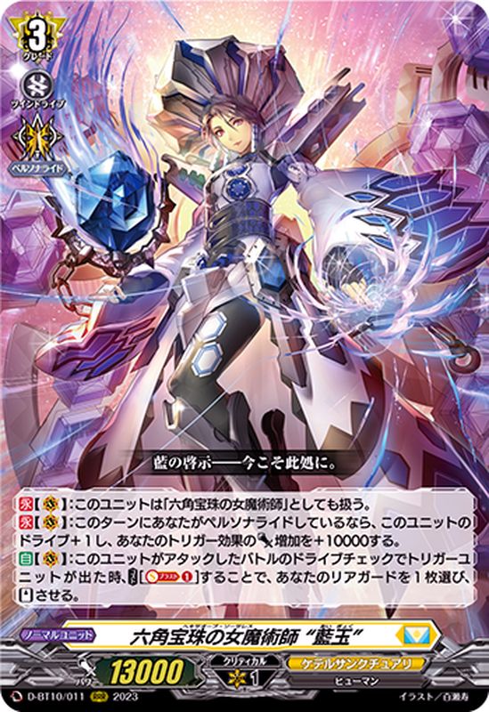 【永】【(V)】:このユニットは「六角宝珠の女魔術師」としても扱う。【永】【(V)】:このターンにあなたがペルソナライドしているなら、このユニットのドライブ+1し、あなたのトリガー効果のパワー増加を+10000する。【自】【(V)】:このユニットがアタックしたバトルのドライブチェックでトリガーユニットが出た時、【コスト】[【ソウルブラスト】(1)]することで、あなたのリアガードを1枚選び、【スタンド】させる。