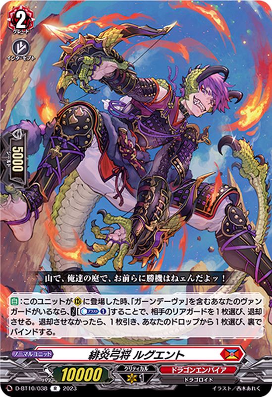 【自】:このユニットが(R)に登場した時、「ガーンデーヴァ」を含むあなたのヴァンガードがいるなら、【コスト】[【カウンターブラスト】(1)]することで、相手のリアガードを1枚選び、退却させる。退却させなかったら、1枚引き、あなたのドロップから1枚選び、裏でバインドする。