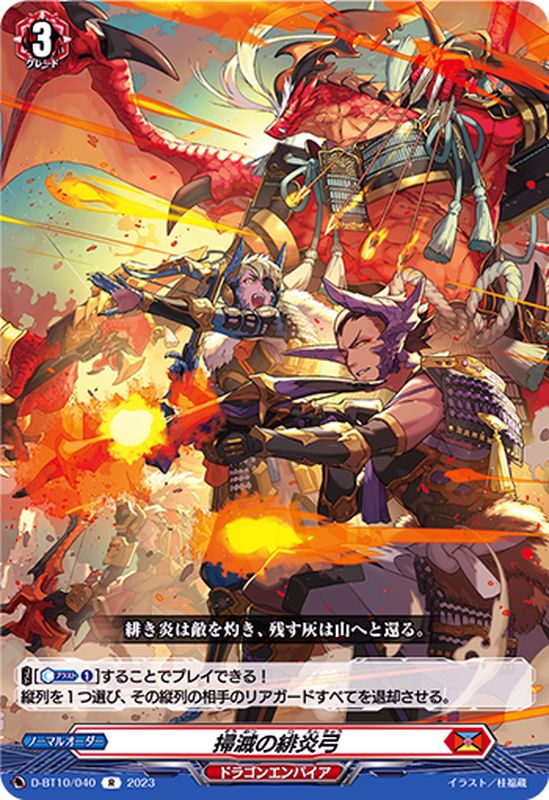 【コスト】[【カウンターブラスト】(1)]することでプレイできる! 縦列を1つ選び、その縦列の相手のリアガードすべてを退却させる。