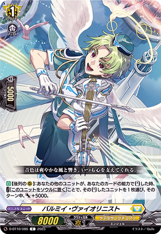 【自】【後列の(R)】:あなたの他のユニットが、あなたのカードの能力で【スタンド】した時、【コスト】[このユニットをソウルに置く]ことで、その【スタンド】したユニットを1枚選び、そのターン中、パワー+5000。