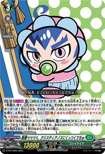 【起】【(V)】【ターン1回】:【コスト】[【エネルギーブラスト】(3)]することで、あなたの山札を上から7枚見て、1枚選び、捨て、山札をシャッフルする。その後、あなたのドロップにブリッツオーダーが1枚以上なら、そのターン中、このユニットは『トリプルドライブ』を得て、4枚以上なら、さらに『【永】【(V)】:あなたの前列のユニットすべてのパワー+5000。』を得る。 【自】【(V)】:あなたのバトルフェイズ開始時、【コスト】[【カウンターブラスト】(1)]することで、あなたのドロップから1枚選び、(R)にコールする。あなたのドロップにブリッツオーダーが4枚以上なら、1枚ではなく2枚まで選ぶ。