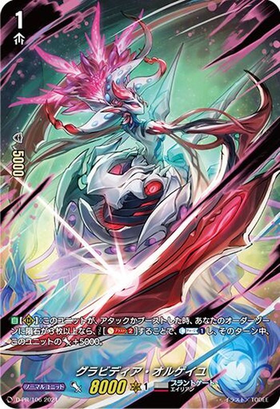 【自】【(R)】:このユニットが、アタックかブーストした時、あなたのオーダーゾーンに隕石が3枚以上なら、【コスト】[【ソウルブラスト】(2)]することで、【カウンターチャージ】(1)し、そのターン中、このユニットのパワー+5000。