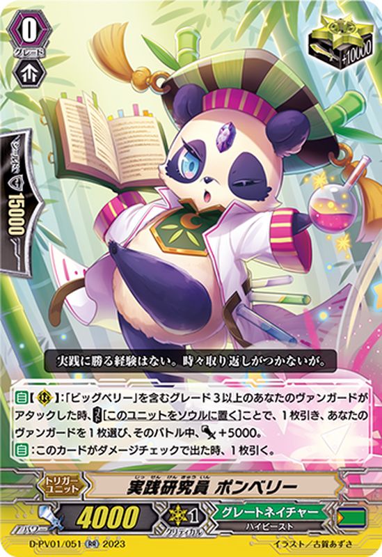 【自】【(R)】:「ビッグベリー」を含むグレード3以上のあなたのヴァンガードがアタックした時、【コスト】[このユニットをソウルに置く]ことで、1枚引き、あなたのヴァンガードを1枚選び、そのバトル中、パワー+5000。【自】:このカードがダメージチェックで出た時、1枚引く。