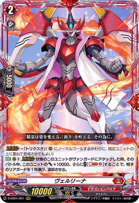 【オーバードレス】-「トリクスタ」((R)にノーマルコールするかわりに、指定ユニットの上に重ねて登場させてもよい)【自】【(R)】:【オーバードレス】状態のこのユニットがヴァンガードにアタックした時、そのバトル中、このユニットのパワー+10000。さらに【コスト】[【ソウルブラスト】(2)]することで、相手のリアガードを1枚選び、退却させる。