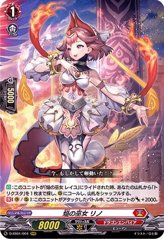 【自】:このユニットが「焔の巫女 レイユ」にライドされた時、あなたの山札から「トリクスタ」を1枚まで探し、(R)にコールし、山札をシャッフルする。【永】【(V)/(R)】:このユニットがアタックしたバトル中、このユニットのパワー+2000。
