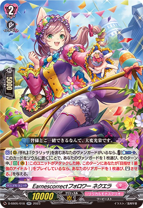 【起】【(R)/手札】:「クラリッサ」を含むあなたのヴァンガードがいるなら、【コスト】[【カウンターブラスト】(1),このカードをソウルに置く]ことで、あなたのヴァンガードを1枚選び、そのターン中、『【自】【(V)】:このユニットがアタックした時、このターンにあなたが「目指せ!最強のアイドル!」をプレイしているなら、あなたのリアガードを1枚選び、【スタンド】させる。』を与える。