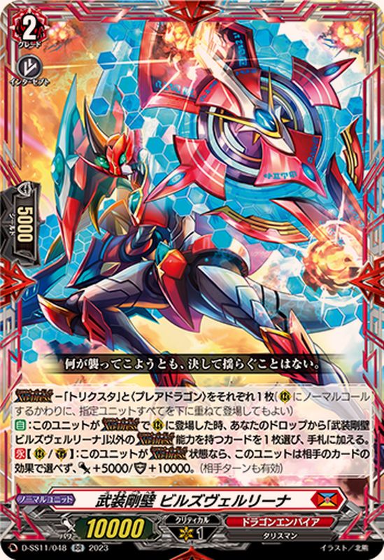 【クロスオーバードレス】-「トリクスタ」と〈プレアドラゴン〉をそれぞれ1枚((R)にノーマルコールするかわりに、指定ユニットすべてを下に重ねて登場してもよい)【自】:このユニットが【クロスオーバードレス】で(R)に登場した時、あなたのドロップから「武装剛壁 ビルズヴェルリーナ」以外の【クロスオーバードレス】能力を持つカードを1枚選び、手札に加える。【永】【(R)/(G)】:このユニットが【クロスオーバードレス】状態なら、このユニットは相手のカードの効果で選べず、パワー+5000/シールド+10000。(相手ターンも有効)