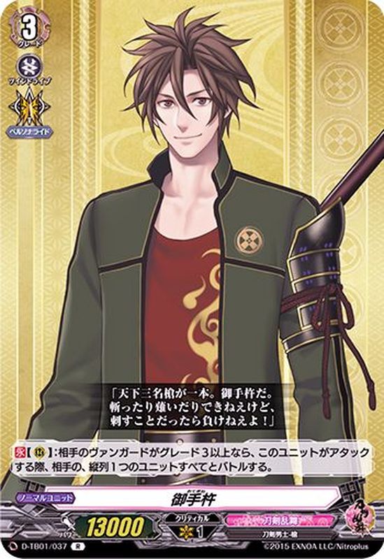 フレバーテキスト:「天下三名槍が一本。御手杵だ。斬ったり薙いだりできねえけど、刺すことだったら負けねえよ!」