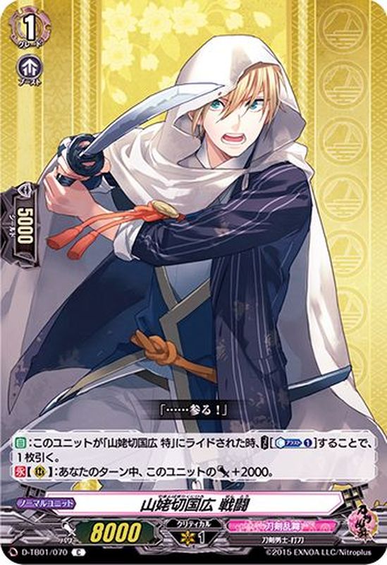 【自】:このユニットが「山姥切国広 特」にライドされた時、【コスト】[【カウンターブラスト】(1)]することで、1枚引く。【永】【(R)】:あなたのターン中、このユニットのパワー+2000。