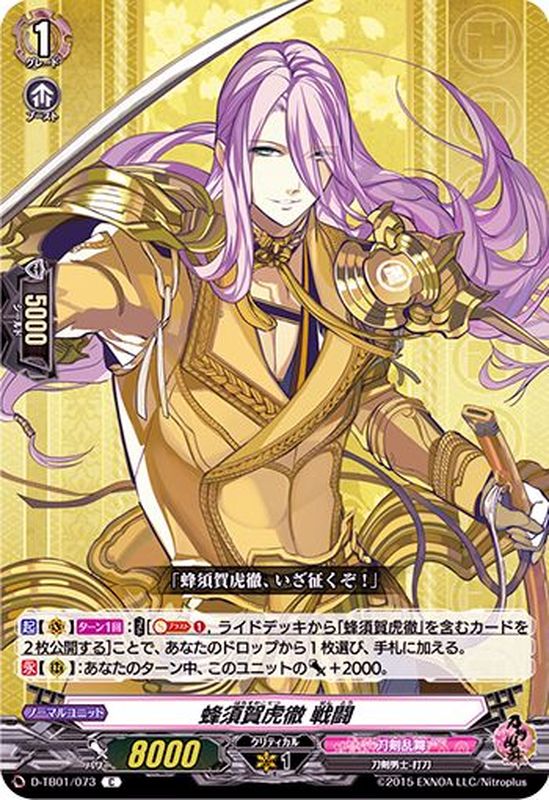 【起】【(V)】【ターン1回】:【コスト】[【ソウルブラスト】(1),ライドデッキから「蜂須賀虎徹」を含むカードを2枚公開する]ことで、あなたのドロップから1枚選び、手札に加える。【永】【(R)】:あなたのターン中、このユニットのパワー+2000。