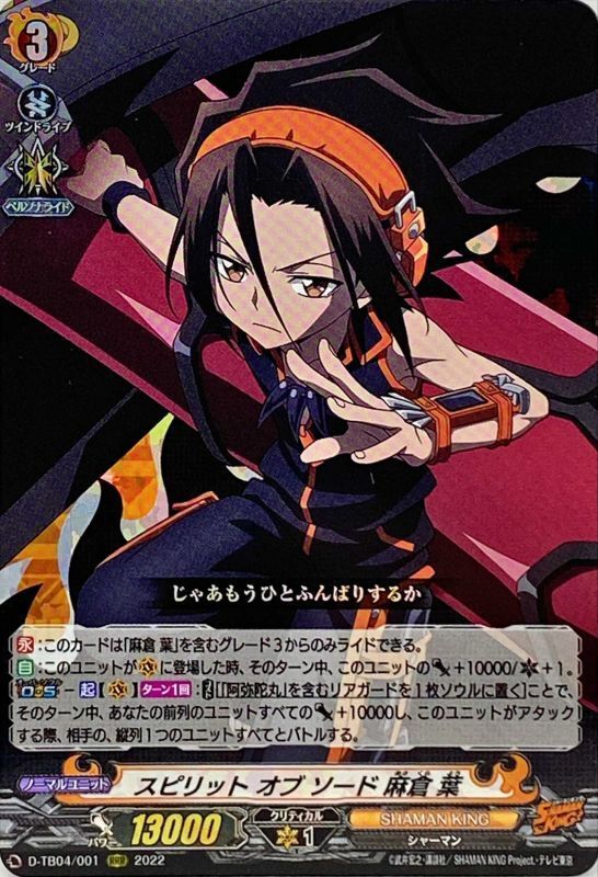 【永】:このカードは「麻倉 葉」を含むグレード3からのみライドできる。【自】:このユニットが(V)に登場した時、そのターン中、このユニットのパワー+10000/クリティカル+1。【オーバーソウル】-【起】【(V)】【ターン1回】:【コスト】[「阿弥陀丸」を含むリアガードを1枚ソウルに置く]ことで、そのターン中、あなたの前列のユニットすべてのパワー+10000し、このユニットがアタックする際、相手の、縦列1つのユニットすべてとバトルする。