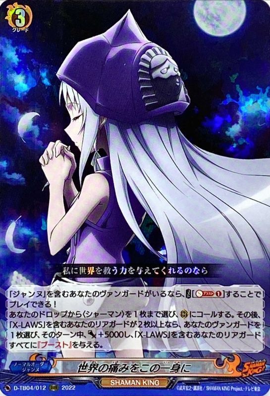 「ジャンヌ」を含むあなたのヴァンガードがいるなら、【コスト】[【ソウルブラスト】(1)]することでプレイできる!あなたのドロップから〈シャーマン〉を1枚まで選び、(R)にコールする。その後、「X-LAWS」を含むあなたのリアガードが2枚以上なら、あなたのヴァンガードを1枚選び、そのターン中、パワー+5000し、「X-LAWS」を含むあなたのリアガードすべてに『ブースト』を与える。