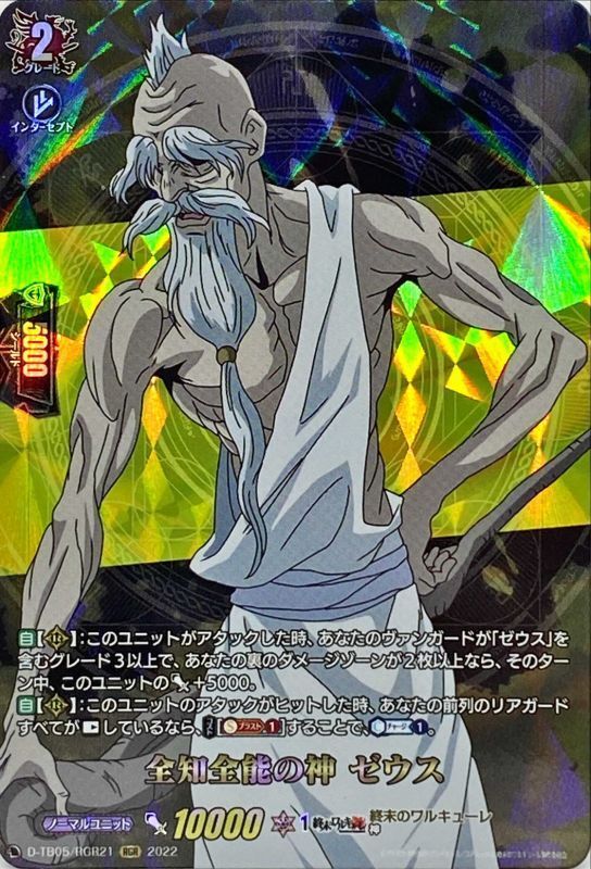 【自】【(R)】:このユニットがアタックした時、あなたのヴァンガードが「ゼウス」を含むグレード3以上で、あなたの裏のダメージゾーンが2枚以上なら、そのターン中、このユニットのパワー+5000。【自】【(R)】:このユニットのアタックがヒットした時、あなたの前列のリアガードすべてが【レスト】しているなら、【コスト】[【ソウルブラスト】(1)]することで、【カウンターチャージ】(1)。