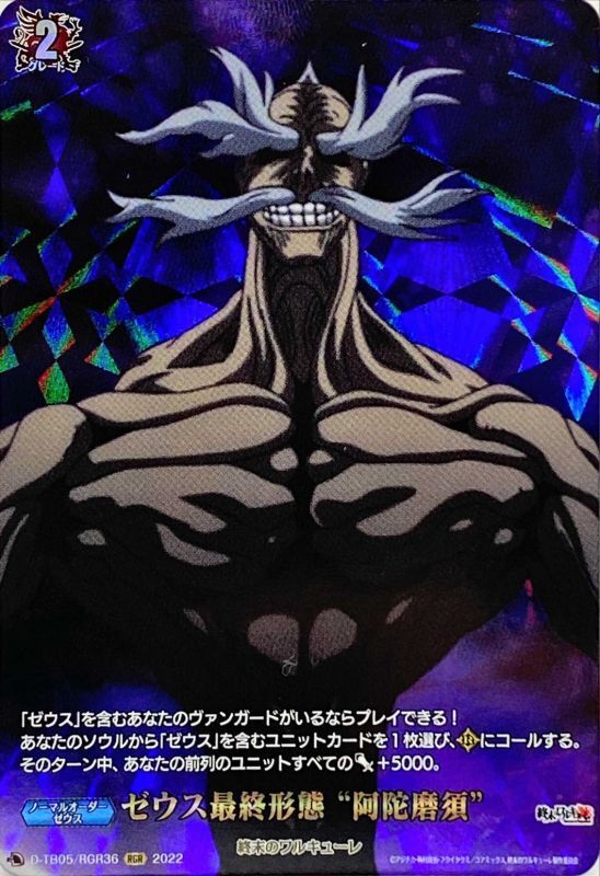 「ゼウス」を含むあなたのヴァンガードがいるならプレイできる!あなたのソウルから「ゼウス」を含むユニットカードを1枚選び、(R)にコールする。そのターン中、あなたの前列のユニットすべてのパワー+5000。