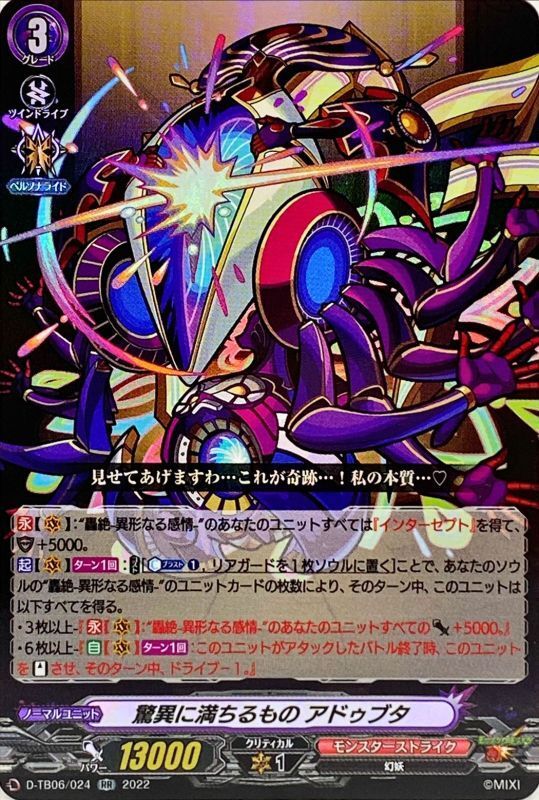 【永】【(V)】:“轟絶-異形なる感情-”のあなたのユニットすべては『インターセプト』を得て、シールド+5000。【起】【(V)】【ターン1回】:【コスト】[【カウンターブラスト】(1),リアガードを1枚ソウルに置く]ことで、あなたのソウルの“轟絶-異形なる感情-”のユニットカードの枚数により、そのターン中、このユニットは以下すべてを得る。・3枚以上-『【永】【(V)】:“轟絶-異形なる感情-”のあなたのユニットすべてのパワー+5000。』・6枚以上-『【自】【(V)】【ターン1回】:このユニットがアタックしたバトル終了時、このユニットを【スタンド】させ、そのターン中、ドライブ-1。』