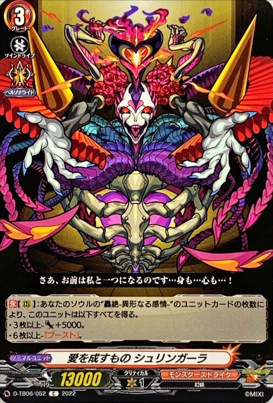 【永】【(R)】:あなたのソウルの“轟絶-異形なる感情-”のユニットカードの枚数により、このユニットは以下すべてを得る。・3枚以上-パワー+5000。・6枚以上-『ブースト』。
