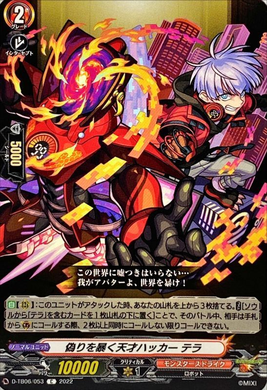 【自】【(R)】:このユニットがアタックした時、あなたの山札を上から3枚捨てる。【コスト】[ソウルから「テラ」を含むカードを1枚山札の下に置く]ことで、そのバトル中、相手は手札から(G)にコールする際、2枚以上同時にコールしない限りコールできない。