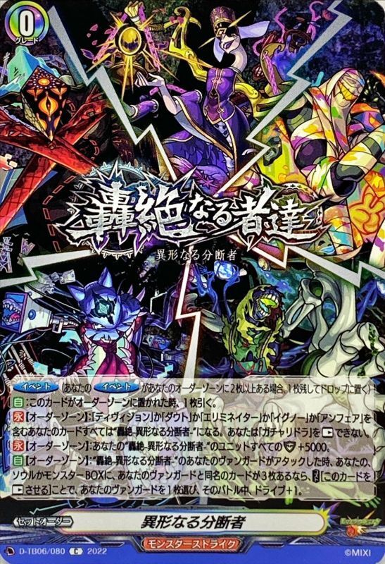 【イベント】(あなたの【イベント】があなたのオーダーゾーンに2枚以上ある場合、1枚残してドロップに置く)【自】:このカードがオーダーゾーンに置かれた時、1枚引く。【永】【オーダーゾーン】:「ディヴィジョン」か「ダウト」か「エリミネイター」か「イグノー」か「アンフェア」を含むあなたのカードすべては“轟絶-異形なる分断者-”になる。あなたは「ガチャリドラ」を【レスト】できない。【永】【オーダーゾーン】:あなたの“轟絶-異形なる分断者-”のユニットすべてのシールド+5000。【自】【オーダーゾーン】:“轟絶-異形なる分断者-”のあなたのヴァンガードがアタックした時、あなたの、ソウルかモンスターBOXに、あなたのヴァンガードと同名のカードが3枚あるなら、【コスト】[このカードを【レスト】させる]ことで、あなたのヴァンガードを1枚選び、そのバトル中、ドライブ+1。