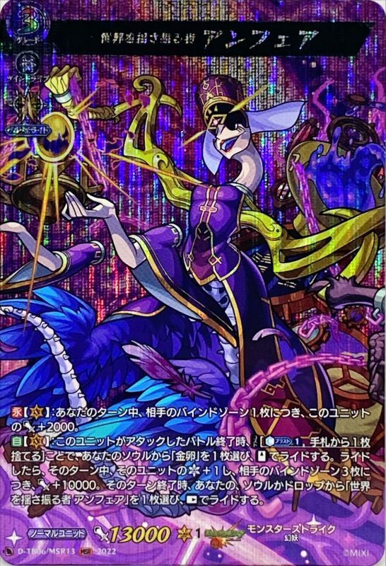 【永】【(V)】:あなたのターン中、相手のバインドゾーン1枚につき、このユニットのパワー+2000。【自】【(V)】:このユニットがアタックしたバトル終了時、【コスト】[【カウンターブラスト】(1),手札から1枚捨てる]ことで、あなたのソウルから「金卵」を1枚選び、【スタンド】でライドする。ライドしたら、そのターン中、そのユニットのクリティカル+1し、相手のバインドゾーン3枚につき、パワー+10000。そのターン終了時、あなたの、ソウルかドロップから「世界を揺さ振る者 アンフェア」を1枚選び、【レスト】でライドする。